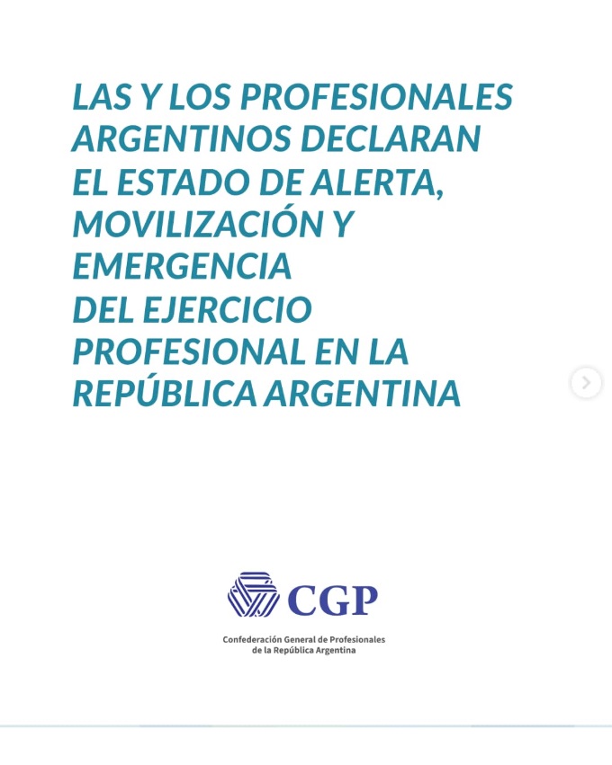 La Confederación General de Profesionales de la República Argentina (C.G.P.) declaró el estado de alerta, movilización y emergencia profesional en todo el territorio de la República Argentina.